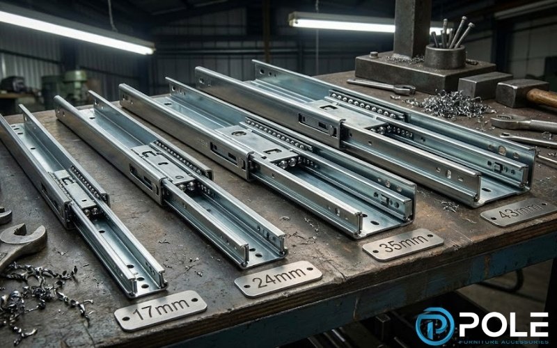 17 mm, 24 mm, 35 mm ve 43 mm çekmece ray modellerimiz çekmece boyutuna ve taşıma ihtiyacınıza bağlı olarak değişmektedir.