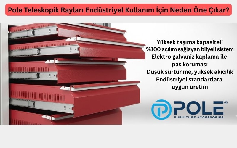 Bu özellikler sayesinde Pole teleskopik rayları; makine imalatı, sanayi dolapları, endüstriyel çekmeceler ve ağır hizmet sistemlerinde güvenle tercih edilir.