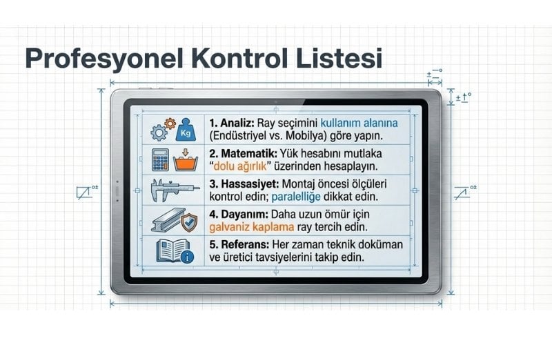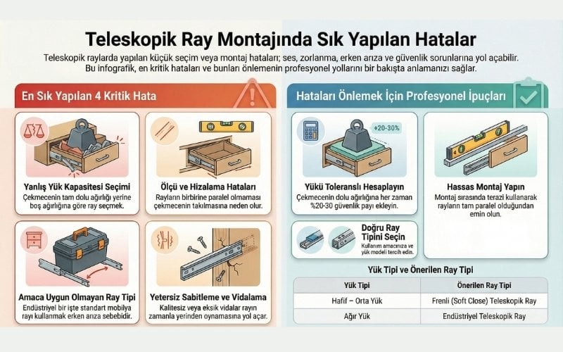 Teleskopik ray montajında en sık yapılan hatalar; yanlış yük kapasitesi seçimi, rayların paralel monte edilmemesi, hatalı ölçü kullanımı ve uygun olmayan ray tipinin tercih edilmesidir. Bu hatalar rayın sesli çalışmasına, erken deformasyona ve güvenlik risklerine yol açar.