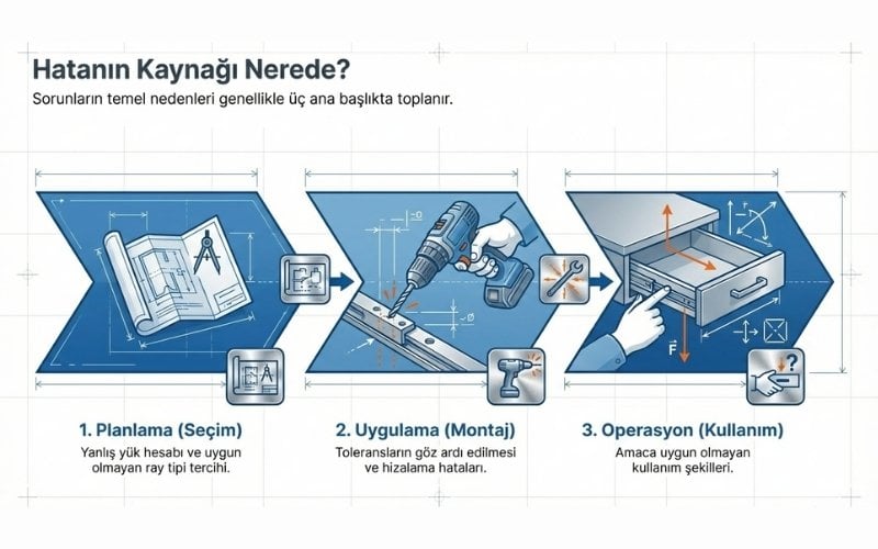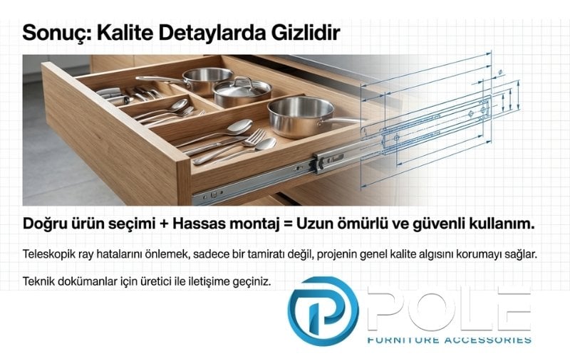 Teleskopik ray, çekmece ve hareketli sistemlerin sorunsuz çalışması için kritik bir bileşendir. Ancak doğru ürün seçilmediğinde veya montaj aşamasında yapılan küçük hatalar; ses, zorlanma, erken arıza ve güvenlik problemleriyle sonuçlanabilir.