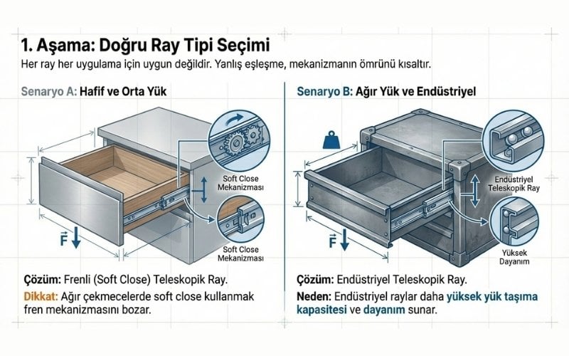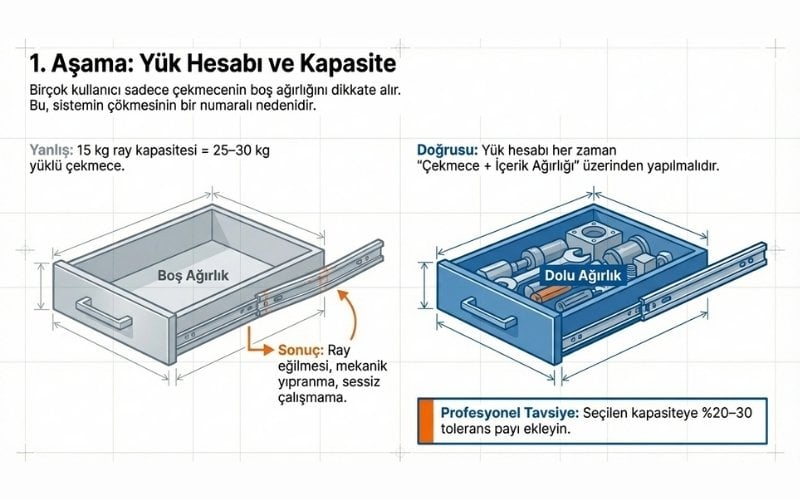 Birçok kullanıcı çekmecenin boş ağırlığını dikkate alarak ray seçer. Oysa asıl belirleyici olan tam dolu ağırlıktır.