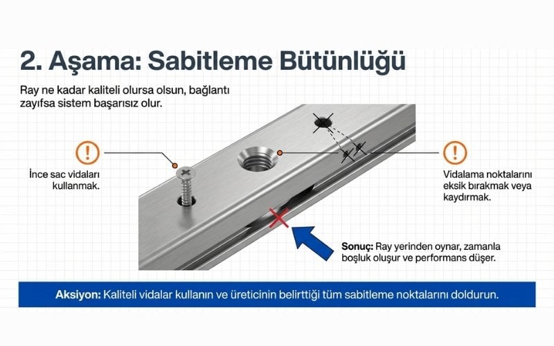 Kalitesiz veya kısa vidalar, ray performansını doğrudan etkiler.