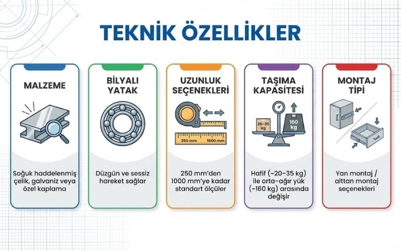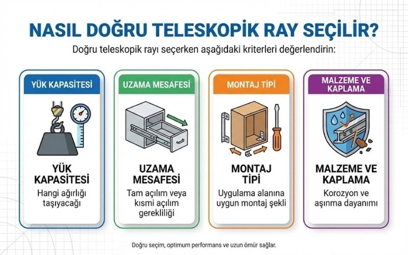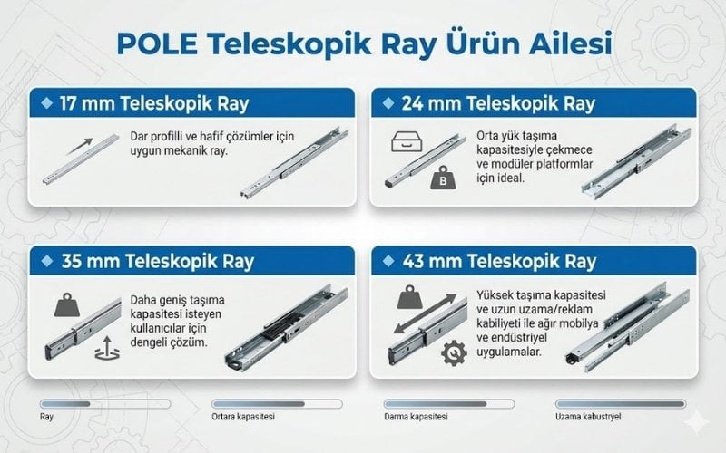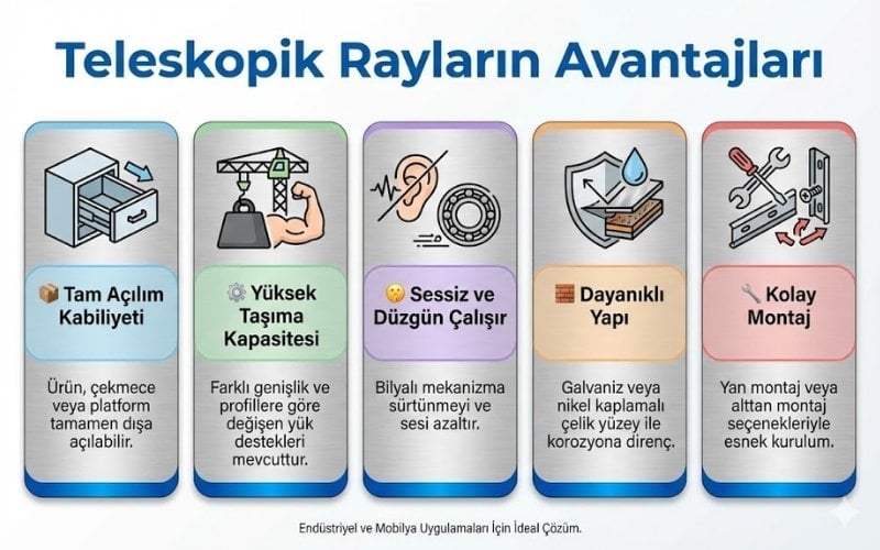 Teleskopik raylar; yüksek taşıma kapasitesi, sessiz açılım ve uzun ömürlü kullanım sağlayarak mobilya ve endüstriyel çözümlerde fonksiyonelliği artırır.